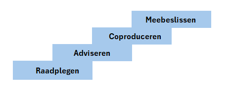 - De gemeente wil duidelijkheid bieden aan de samenleving over het niveau van participatie. De volgende niveaus worden onderscheiden: raadplegen, adviseren, coproduceren of meebeslissen of een combinatie hiervan.